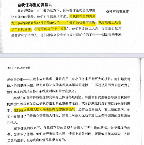 作者:夜止小儿啼 链接:https://www.zhihu.com/question/1997350465780855142/answer/1997350867024766230 来源:知乎 著作权归作者所有。商业转载请联系作者获得授权,非商业转载请注明出处。 先占个坑,稍后补充过程:草草是sp9 9641.3号、6号及9号的两种模式。唐·里索认为,基础型人格(369,里索的称呼)不同于第二类人格(124578,同样是里索的称呼),基础人格型有两种模式,而第二类人格只有一种模式。基础型人格与他们自己的中心有隔阂,而第二类人格能直接运用他们自己的中心。<img src="https://picx.zhimg.com/50/v2-bd831a279fcd35f83830073f201a2535_720w.jpg?source=2c26e567" data-rawwidth="461" data-rawheight="526" data-size="normal" data-original-token="v2-bd831a279fcd35f83830073f201a2535" class="origin_image zh-lightbox-thumb" width="461" data-original="https://pica.zhimg.com/v2-bd831a279fcd35f83830073f201a2535_r.jpg?source=2c26e567"/>里索以腹区举例,9号不同于同为腹区的8号与1号,他们在一般状态下并不与其腹中心进行直接连接,反而主要运用心中心与脑中心。由此,9号即存在两种模式,一种寻常模式(里索称之为白日梦模式),即运用心中心及脑中心的模式,另一种是特殊模式(里索称之为本能模式),即运用腹中心的模式。4号及5号会运用心中心、脑中心,与一般情况下的9号类似。换而言之,9号在通常情况下表现出类似4号与5号的退缩组模式,而在特殊情况下则会与自身腹中心进行联系,展现出腹区的对抗环境。2.本能副型与不同主型相结合会造成不同的表征。SP类型关心金钱、食物、人身安全、舒适……一对一类型想要令人亢奋的体验。SO类型专注于与他人互动,想要更高的社会地位。但同一副型与不同主型结合后会造成截然不同的外在表现。SP4认同了自身虚假的匮乏感,因而更会努力工作,希望以工作降低自身的匮乏感。SP4的SP主要体现在努力工作赚钱与布置优雅环境上,SP4需要独一无二的美感来维持自身的特殊性。SP7则认同了对新奇未来的无限向往,他们对切实具体、能保障生存的事务表现出贪婪特性,他们通过囤积物资、金钱、人脉来缓解对未来的焦虑。有时候,E7的自保型展现出一种近乎E5贪婪式的简朴。他倾向于对金钱和行动有极强的控制,同时不断计算成本与收益。他非常重视金钱,一旦看到自己陷入财政困境就会感到头晕目眩。但他在消费上的困难,被他在投资、做“生意”上的极大能力所缓和,有时甚至带有一丝妄想自大的味道。他的实用感渗透到一切事物中:他不想让生活变得复杂,并试图避免一切可能带来不快的事物。在背景中,有一种强烈的对匮乏的恐惧。……然而,“家庭”这个词并不精确。其它词语,如“共谋”(complicity)、“串通”(collusion)、或尤其是“牵连”(involvement),可能更贴切。因为E7自保型并不一定是家庭导向的人,也未必比别人花更多时间与家人相处。相反,在私底下,他们往往很难维系关系,表现出缺乏透明度、沟通、情感与信任的问题,并且倾向于情感隔离、激进的自主性、个人主义,以及不惜一切代价的独立性—— 奥斯卡·伊查索(Oscar Ichazo)称这个角色为“城堡的守卫者”(guardian of the castle),揭示其类分裂型(schizoid)的本源。7号的激情虽然是“暴食”,SP本能也被认为与食物有关,但SP7反而是不喜欢吃的那个。SP7处理物资的方式是节制,他们对物资有着通向未来的安排,不会在现在就消耗殆尽。九型人格的激情/原罪并不能望文生义,不是说“守财奴就是5号”、不是“贪吃鬼就是7号”。SP8同样喜欢保管物资,但SP8保管物资并非是为了通向未来的可能性,而是为了控制环境。暂且不论“谁有钱谁老大”是否正确,但内在心理通俗易懂,不再冗述。SP9则截然不同,SP9会享受物资。他们会用物资安抚自己,让自己放松心情,尤其是通过进食来让自己舒缓身心。<img src="https://picx.zhimg.com/50/v2-775625d7973283663f5b18760158d08b_720w.gif?source=2c26e567" data-rawwidth="567" data-rawheight="571" data-size="normal" data-original-token="v2-775625d7973283663f5b18760158d08b" data-thumbnail="https://pic1.zhimg.com/50/v2-775625d7973283663f5b18760158d08b_720w.jpg?source=2c26e567" class="origin_image zh-lightbox-thumb" width="567" data-original="https://pic1.zhimg.com/v2-775625d7973283663f5b18760158d08b_r.jpg?source=2c26e567"/>里索3.思维三元组.在九型人格中,脑中心/脑区/思维三元组被认为与“恐惧、焦虑”有关,他们都是未来导向的。为应对未来可能的危机,他们各自有着不同的策略。5号(5fix)会习得各种技能、增长自己的能力,尤其是离开外界(外物、人际)依然能独立应对一切的能力。7号(7fix)则会逃离心理内在的恐惧,将注意力集中在外界。5号是从外界逃避到内部,而7号是从内部逃离到外界。而6号则二者兼备,即向内逃离以躲避外界威胁,此时会像5号,又向外逃离以避免内在恐惧,此时会像7号。(心区的3号及腹区的9号也有类似的机制,这就是适应组具有适应性的原理,他们会根据情景不同表现出两种截然不同的应对方式。)一般状态下的6号(及6fix)与自身的T中心相隔离,因而他们做出的反应与同样逃向内部却直接接触T中心的5号不同,6号(及6fix)会以心区及腹区的方式揣度未来,使得对未来的模拟带有负面情绪。简而言之,6号(及6fix)对未来的预测不但悲观而且极端,而7号(及7fix)却会逃离这种感受。4.六号的三种变体6号存在两种模式,与F、M中心链接而与T中心隔阂的责任模式,与T中心相连的思维模式。6号又存在两种适应方式,向5号或向7号适应。6号